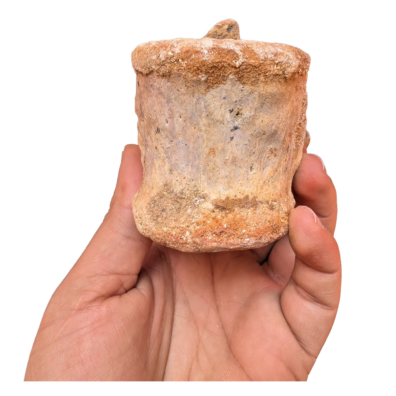 This Authentic Spinosaurus Fossil vertebrae shows clear fossil detail. The centrum is thick and solid. The neural arch is visible depending on the piece. Mineral replacement over millions of years turned bone into stone. Surface texture remains natural. With earthy brown and red tones common to Moroccan material.
