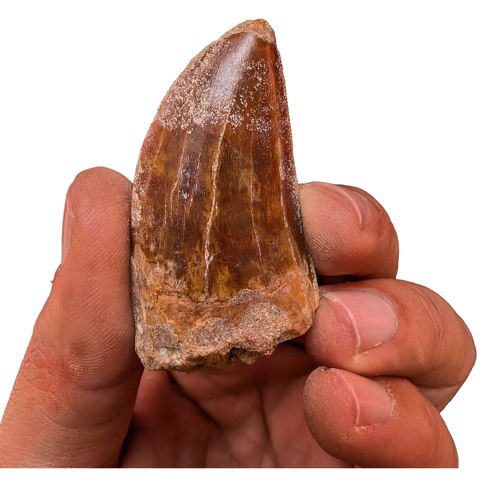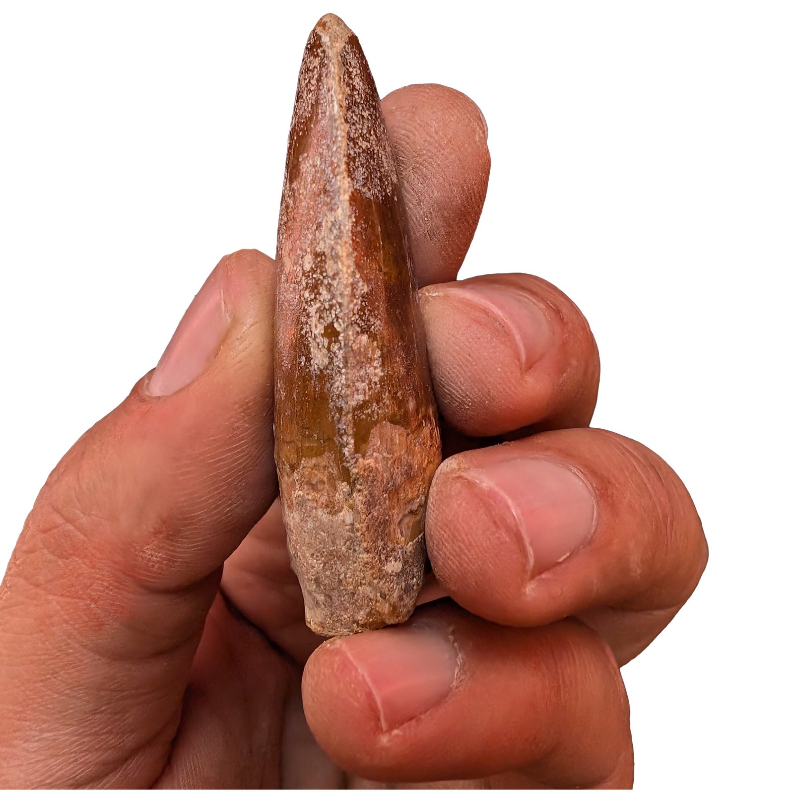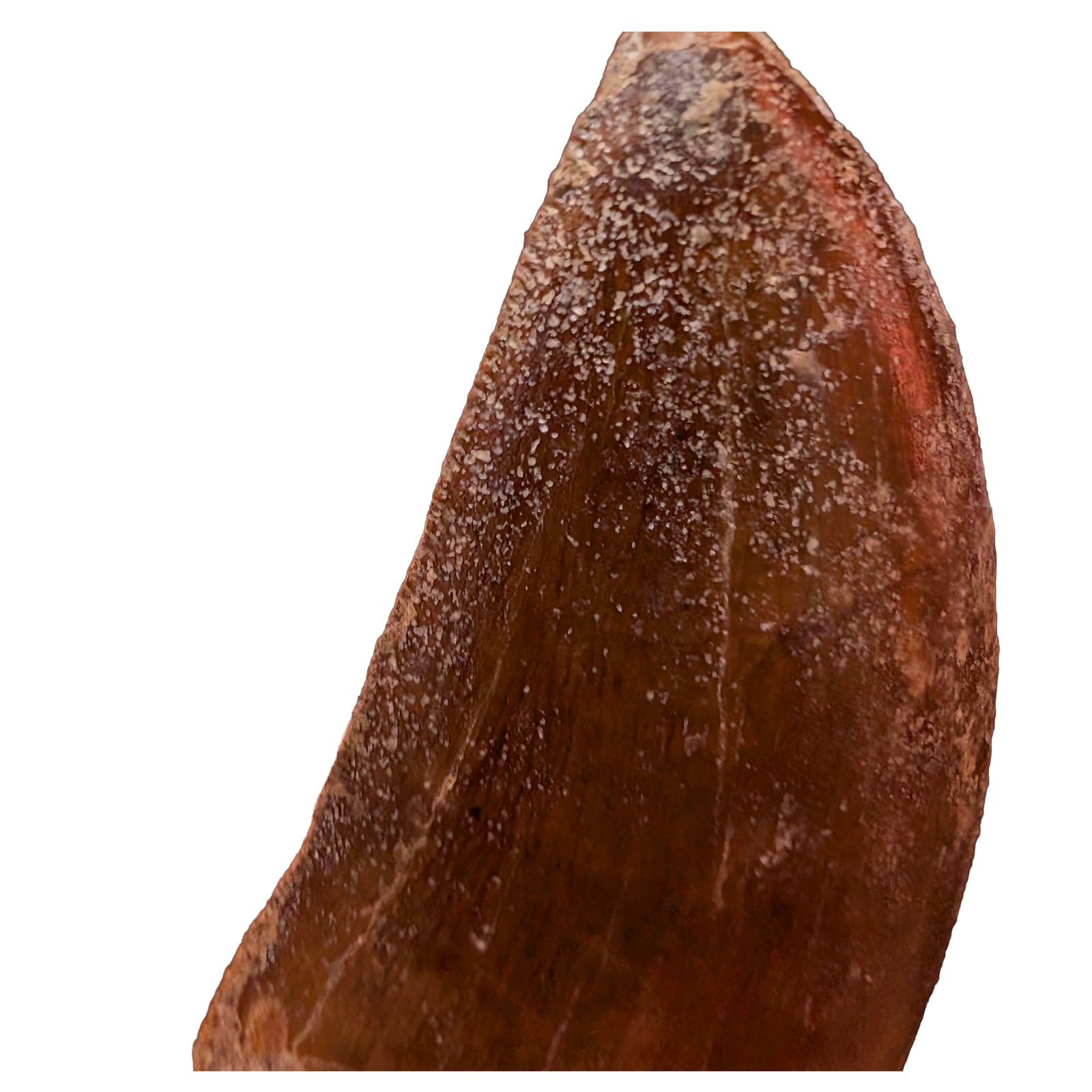 Color varies from deep brown to reddish tan. Minerals replaced the original tooth over millions of years. Turning it into stone while keeping its structure. The tip may show natural wear from feeding.