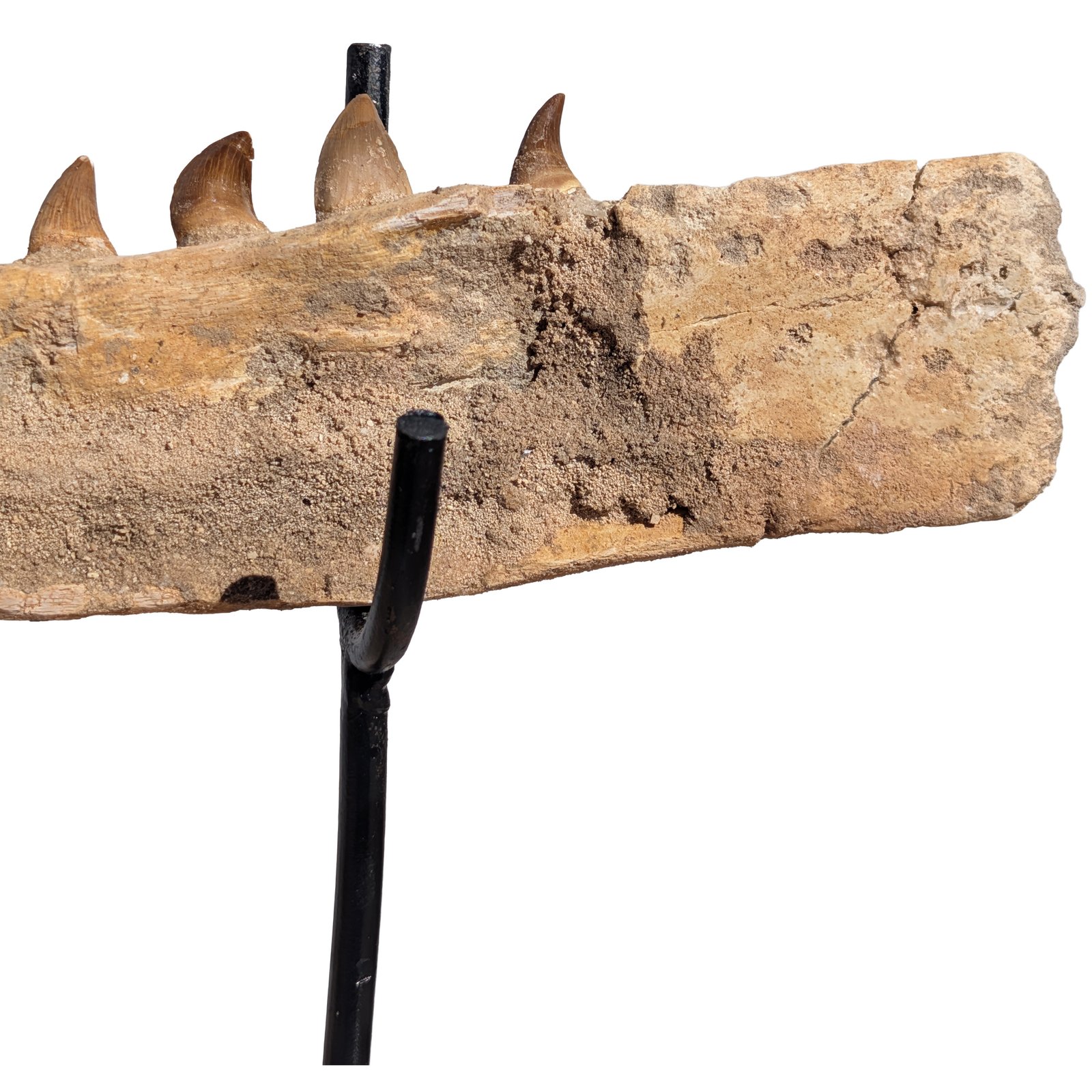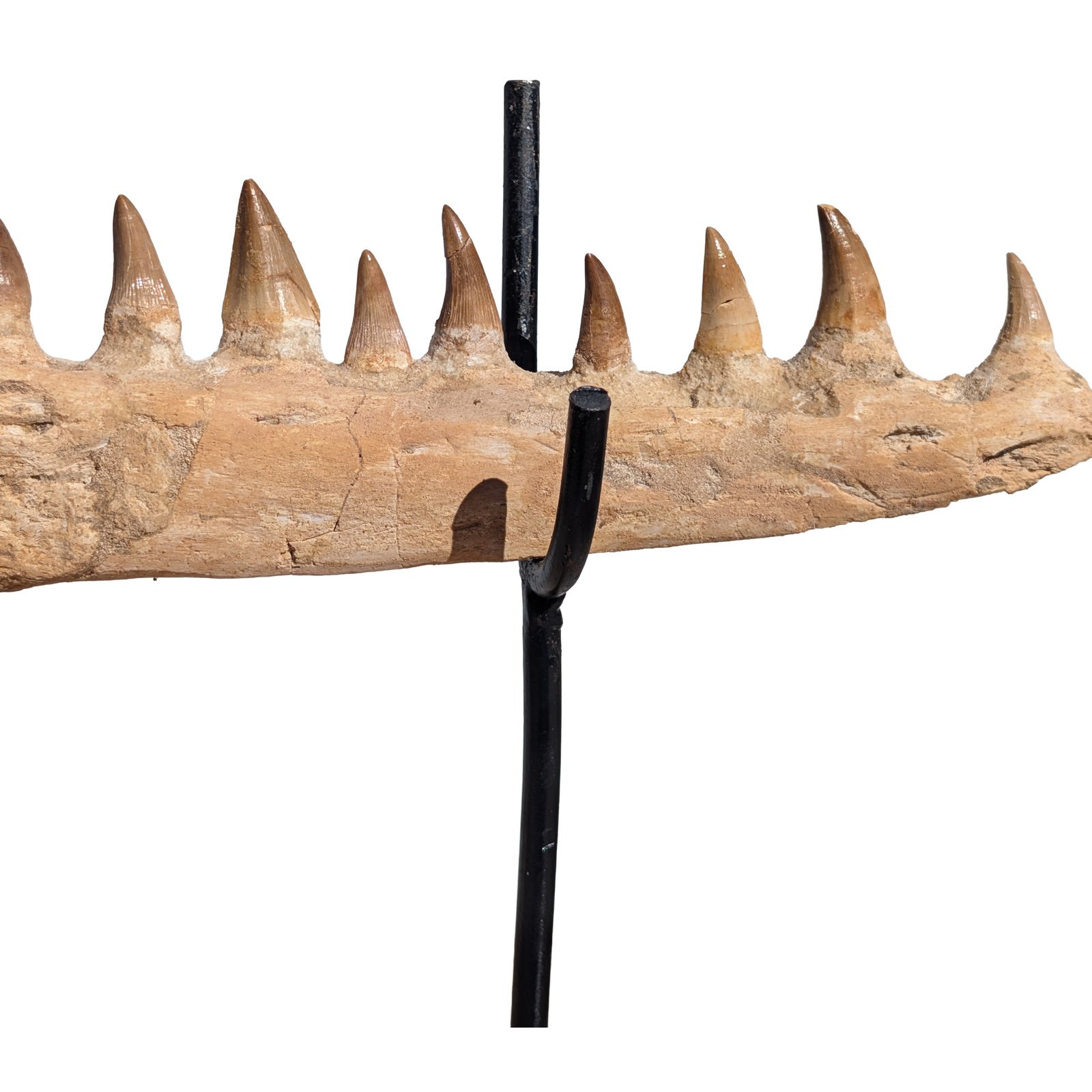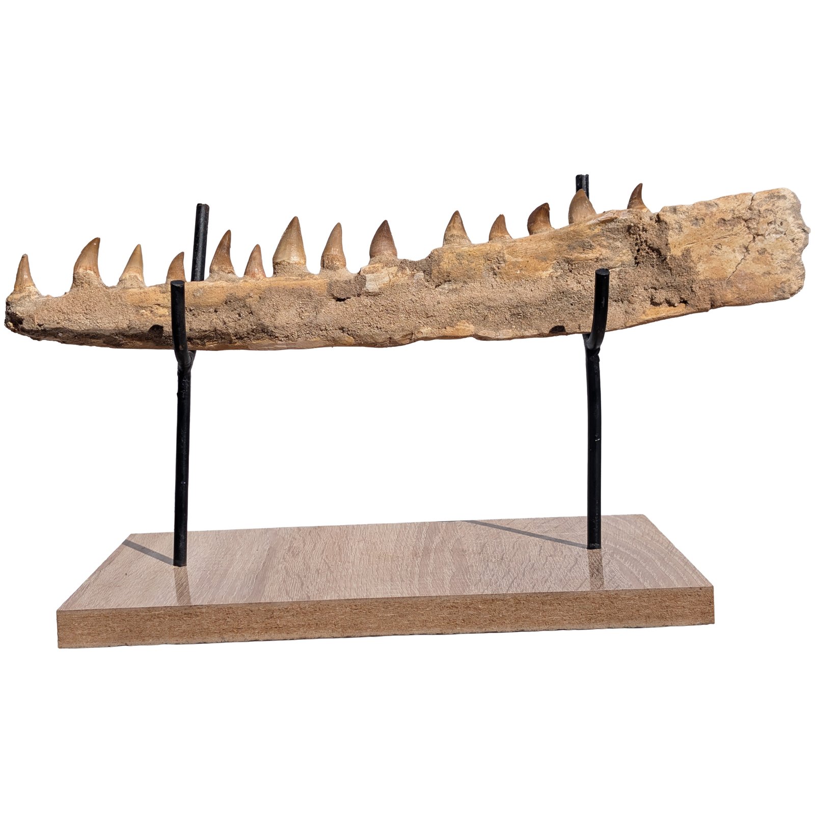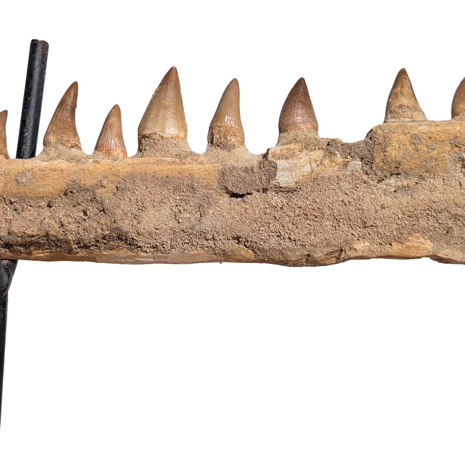 This Mosasaur Jaw Display Piece shows the thick lower jaw bone that supported those teeth. The bone is dense and strong. Built to handle large bites. Fossil teeth sit deep inside the bone sockets.