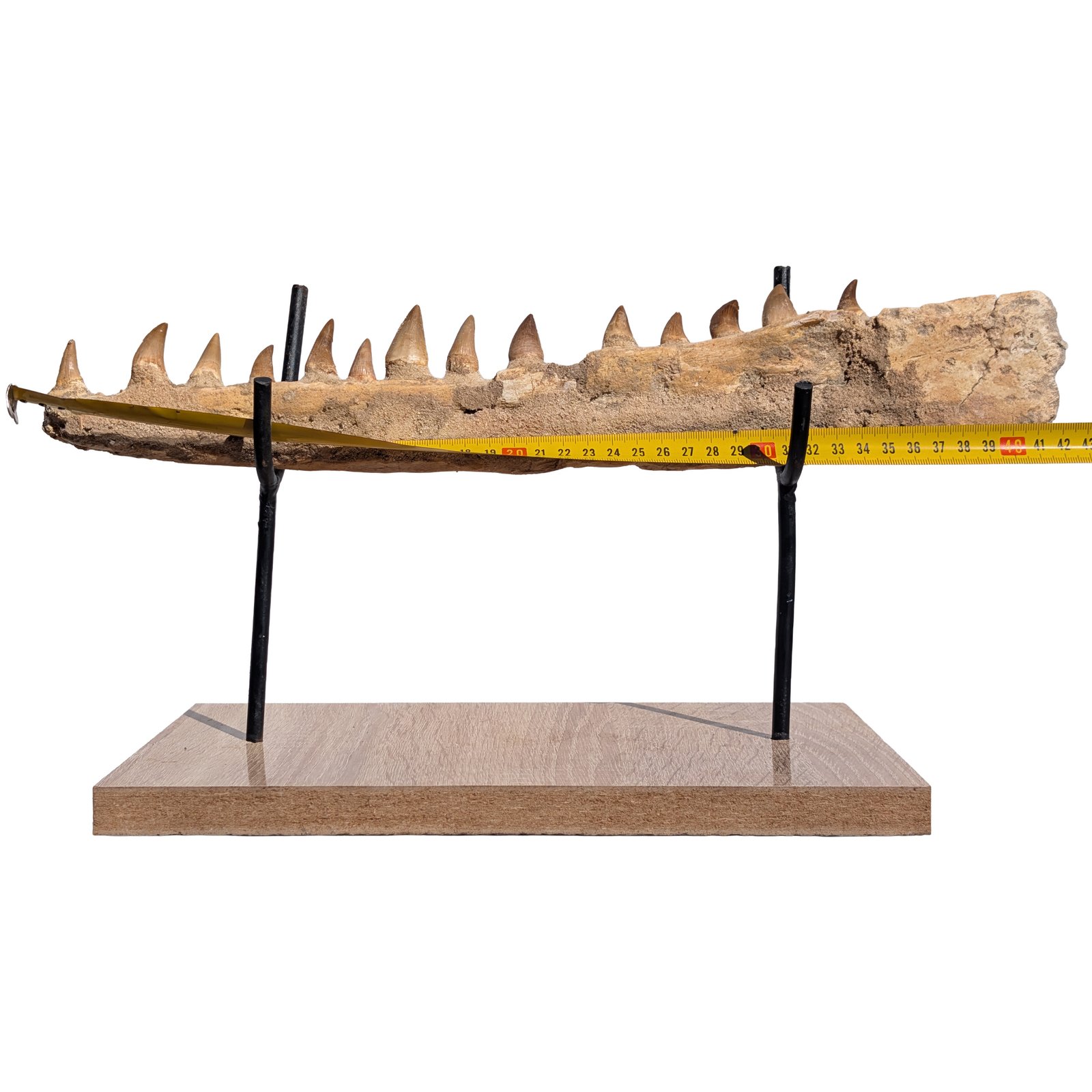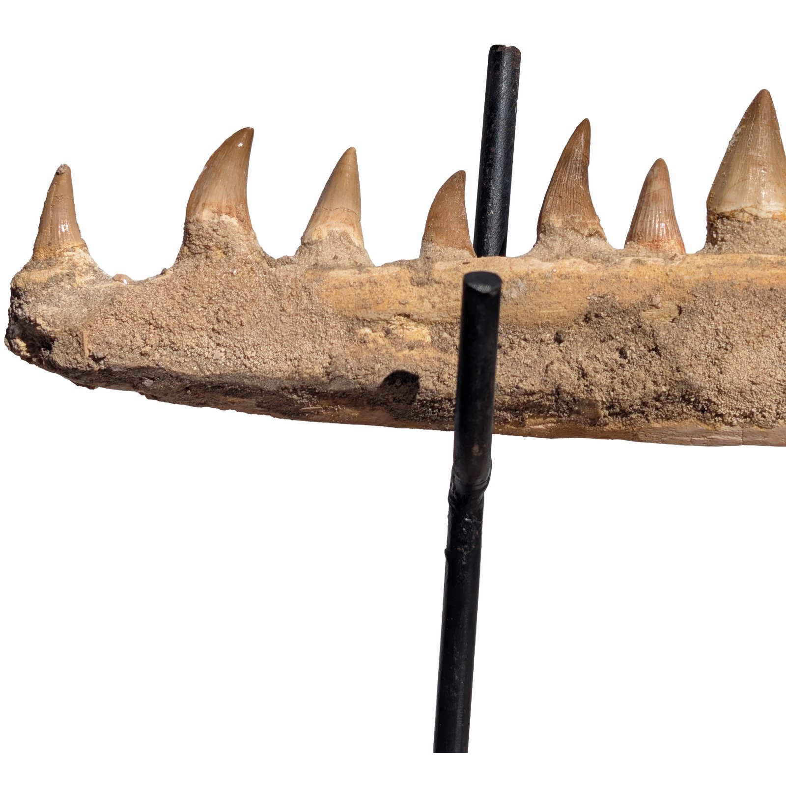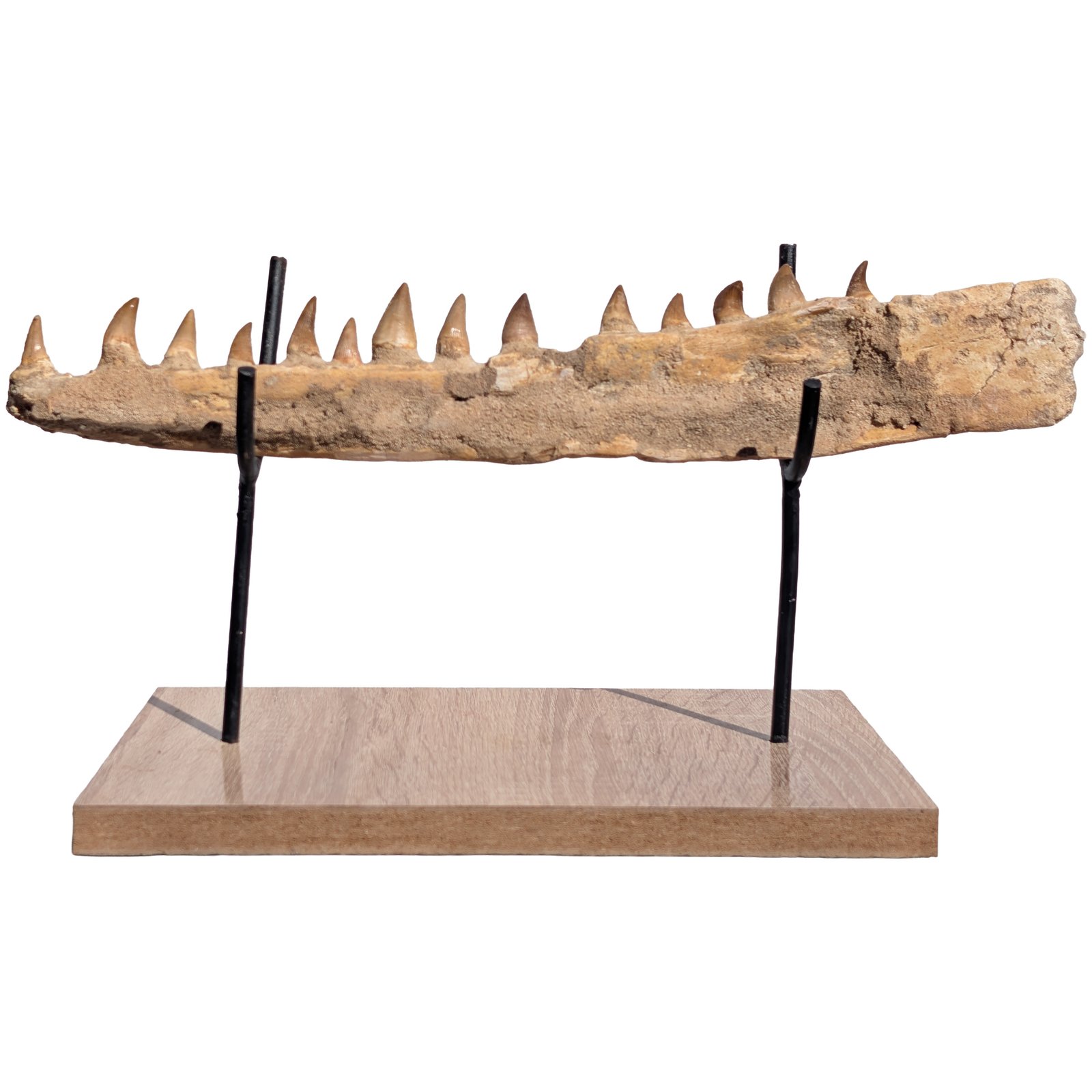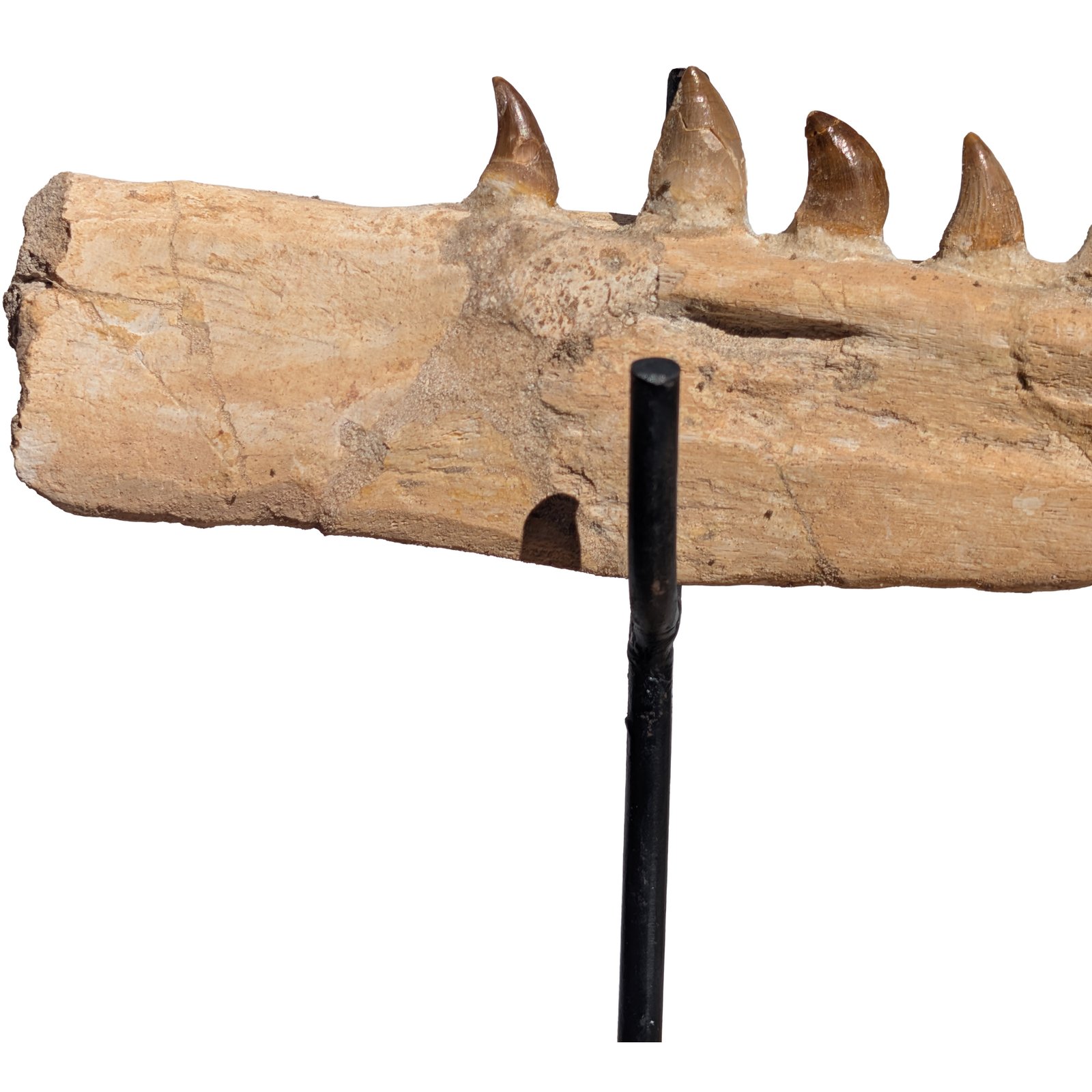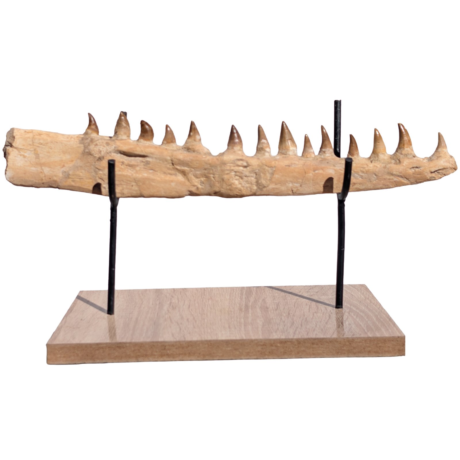 This Mosasaur Jaw Display Piece shows the thick lower jaw bone that supported those teeth. The bone is dense and strong. Built to handle large bites. Fossil teeth sit deep inside the bone sockets.