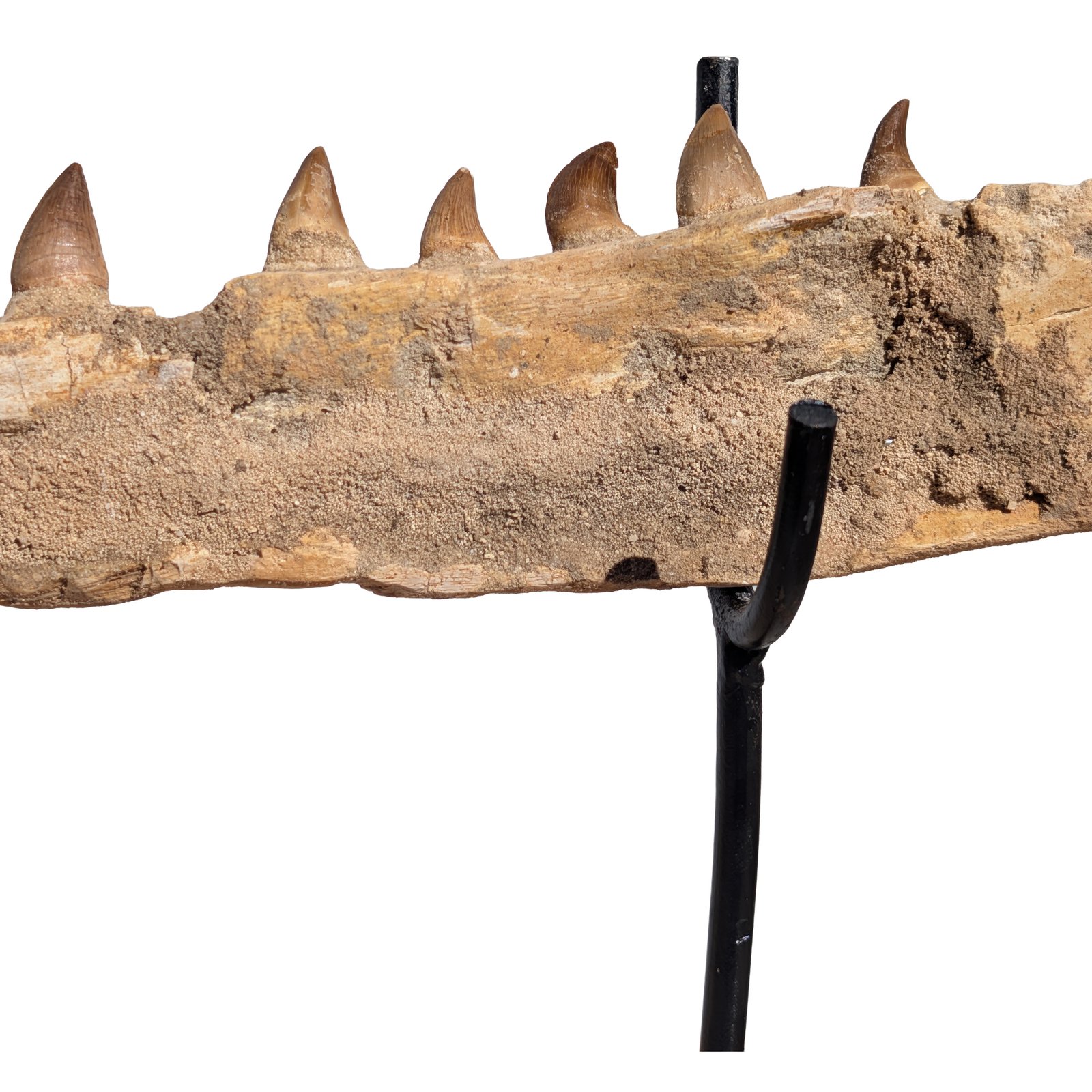 This Mosasaur Jaw Display Piece has been carefully prepared for display. Loose sediment removed. Bone stabilized. Natural fossil surface preserved.