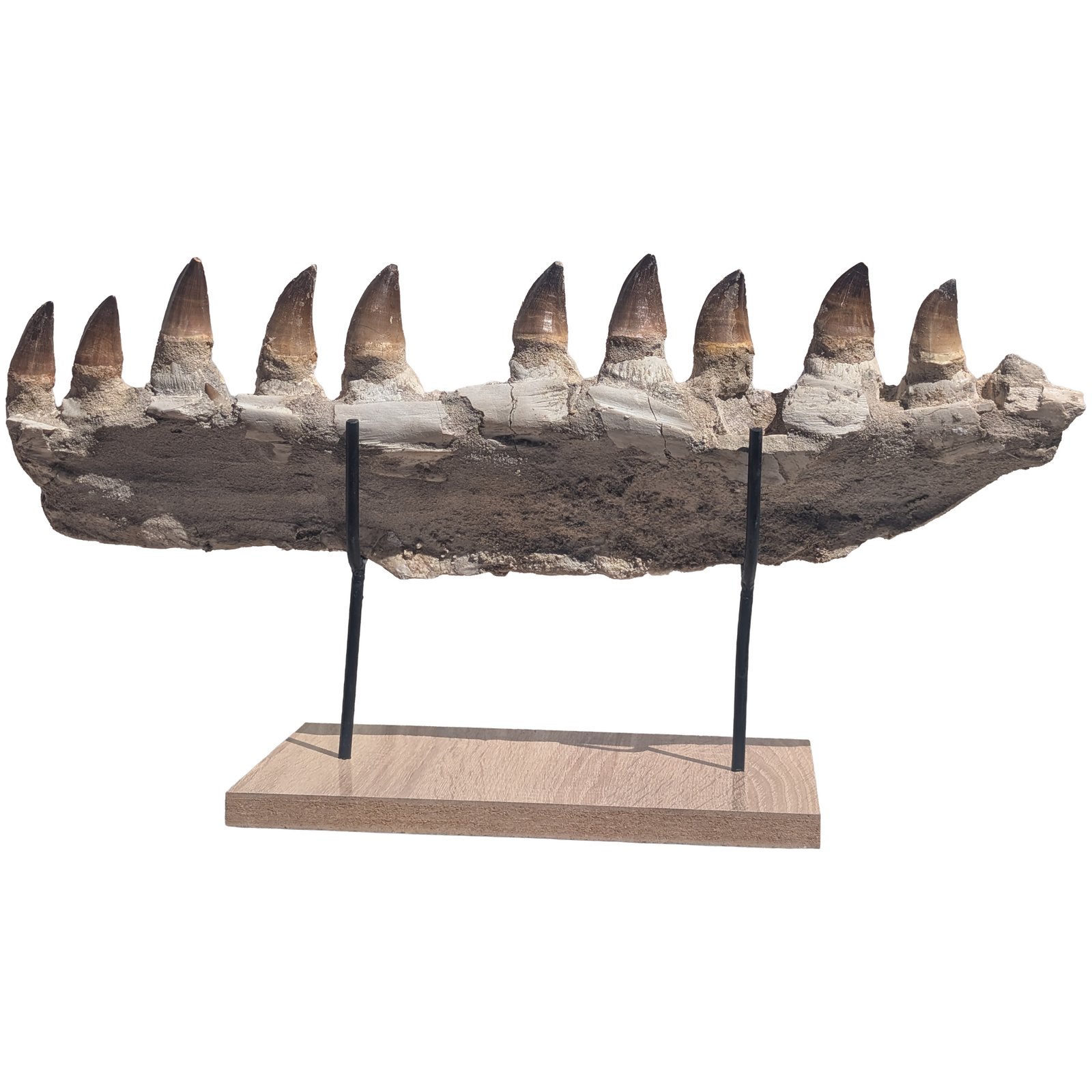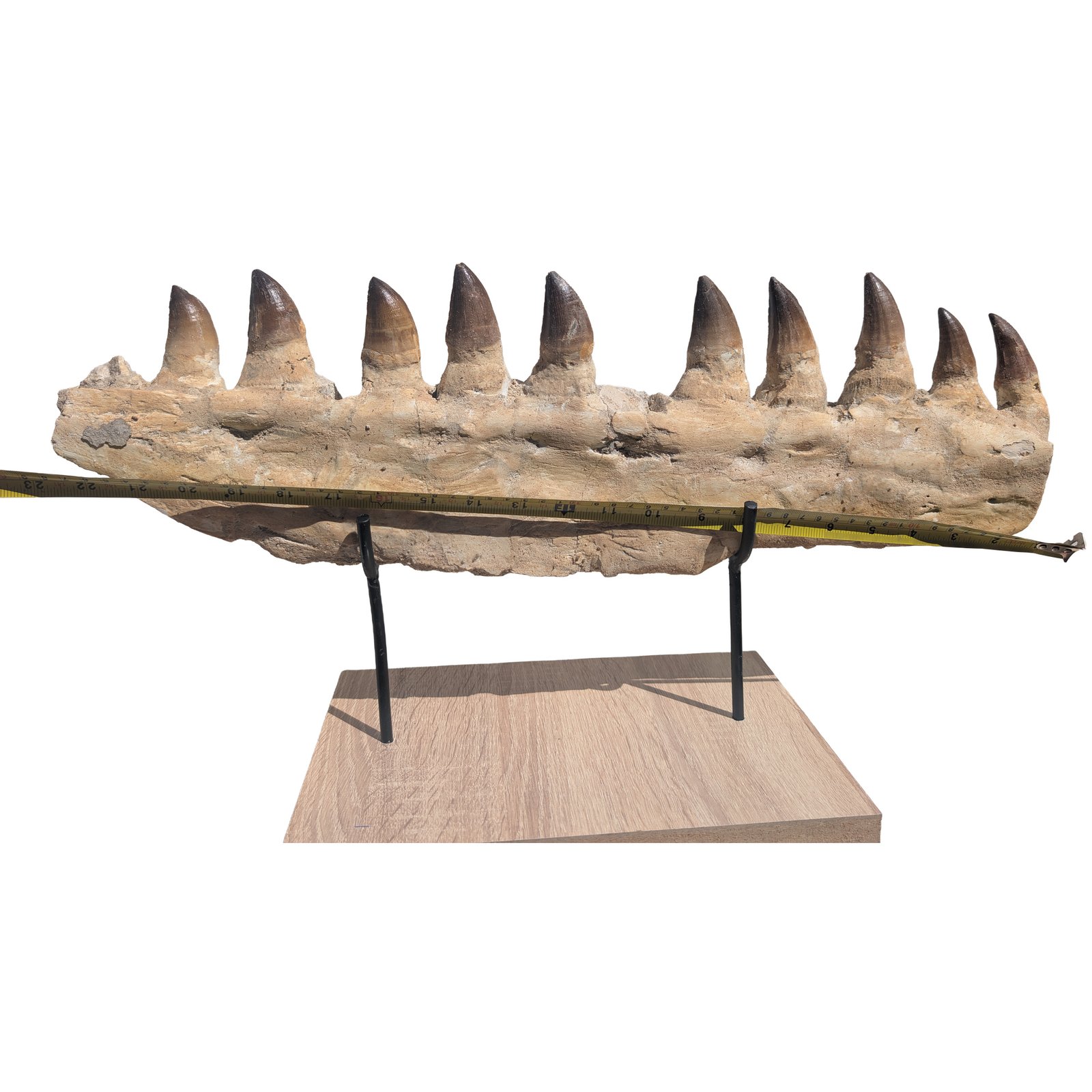 This specimen has been carefully prepared by skilled fossil technicians. Matrix cleaned, stabilized, and reinforced for long-term display. No cast parts. Only genuine fossil material with light restoration for structural integrity. The Mosasaur jaw sits on a custom wood base for display stability. Each piece is one-of-a-kind.