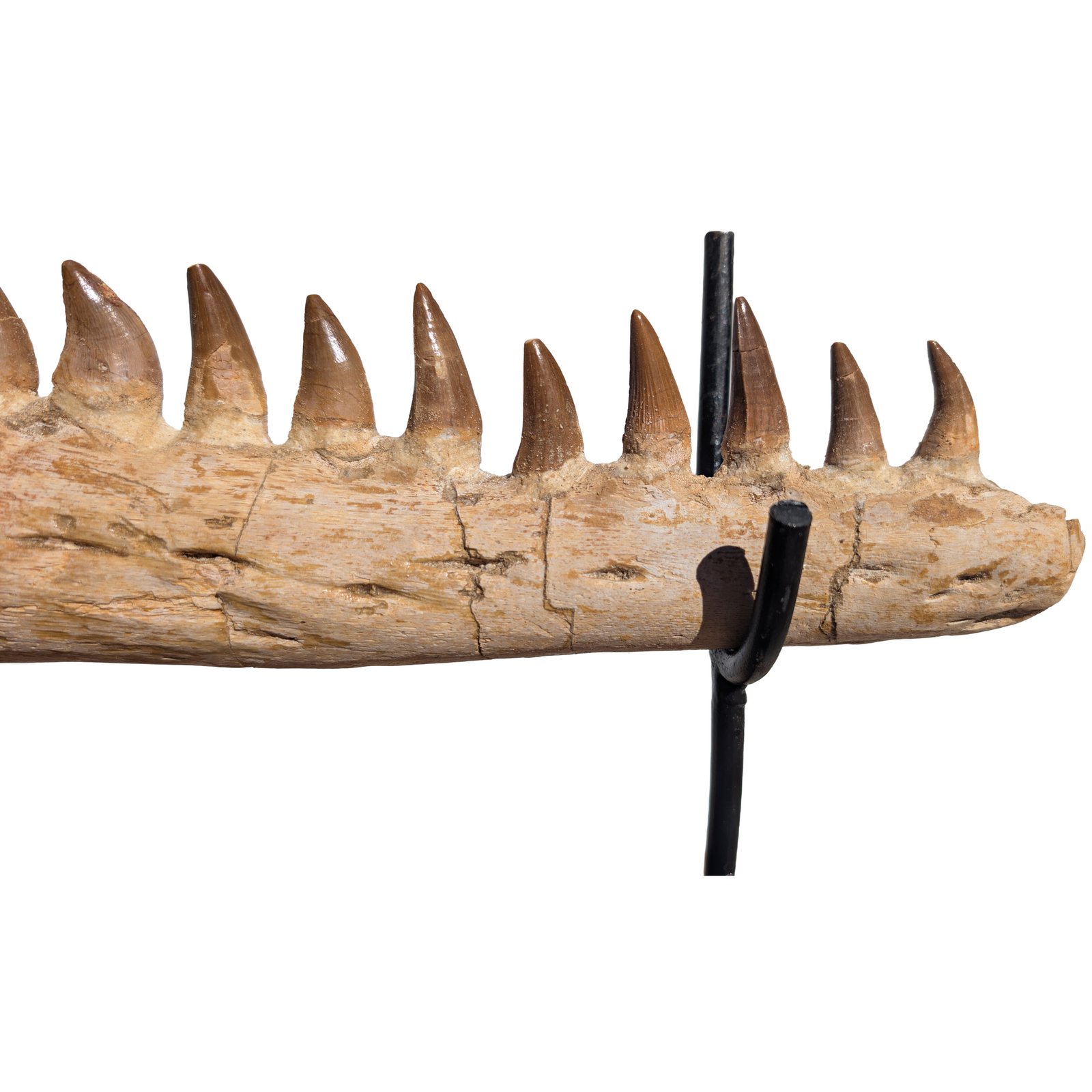 The fossil jaw in this Premium Mosasaur Jaw Display shows the spacing of the teeth sockets. Each tooth anchored deep in the jaw. This gave the predator a strong bite.
