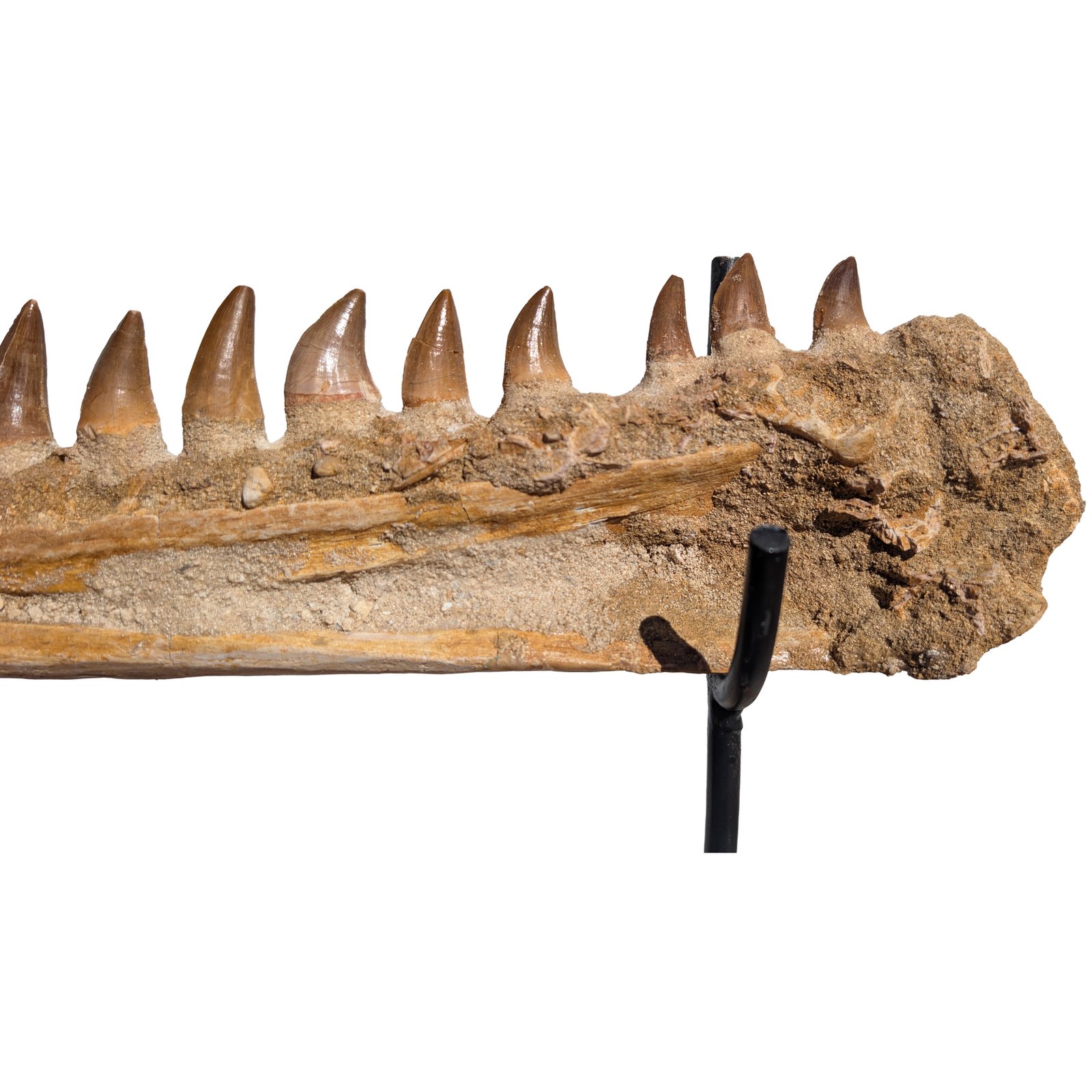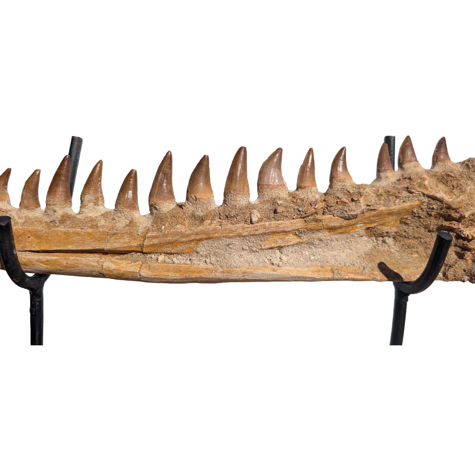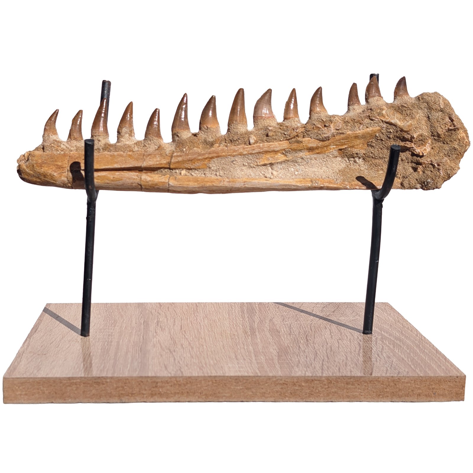 The Premium Mosasaur Jaw Display shows a real section of an ancient sea predator jaw. This Premium Mosasaur Jaw Display holds several natural teeth set in original bone. A strong piece for fossil collectors. Also good for teaching about ocean life from deep time.
