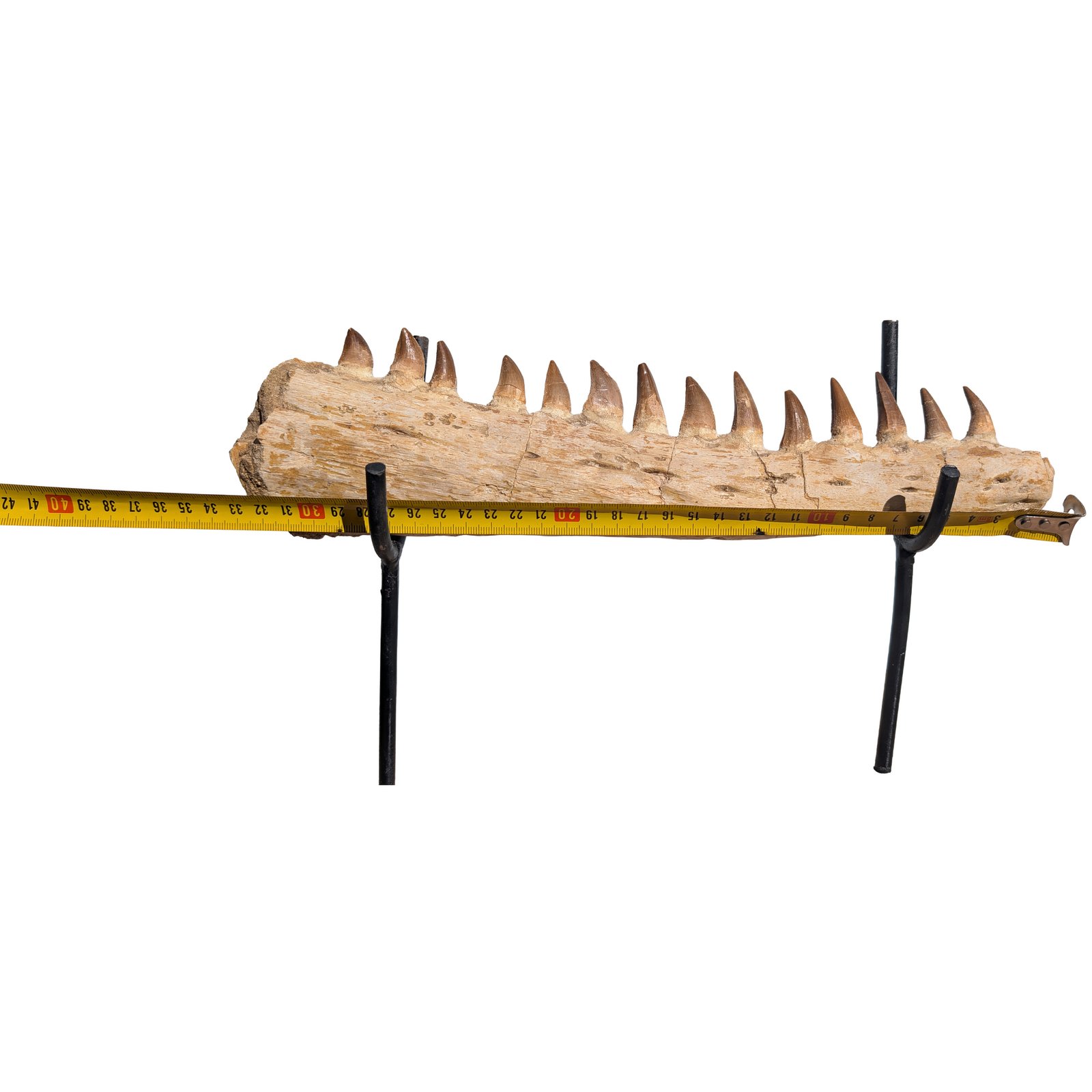 The fossil is set in a simple display mount. Stable and easy to show on a desk or shelf. Many collectors like jaw fossils since they show how the teeth sat in the skull. You can see how the animal hunted.
